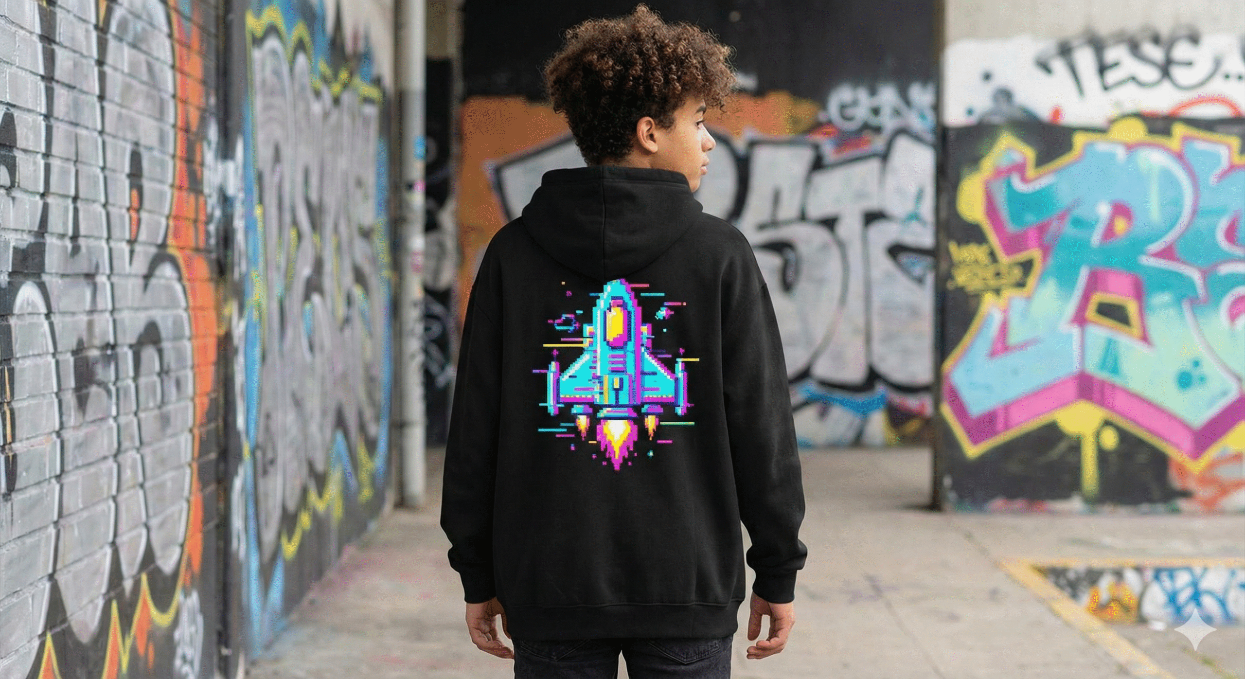 Level up your layer game with our “Retro-Future Glitch” hoodie. This soft, oversized black hoodie features a vibrant, pixelated spaceship graphic on the back that looks straight out of an 80s arcade game. It’s the perfect mix of retro vibes and futuristic style. Great for chilly days or just hanging out with friends.